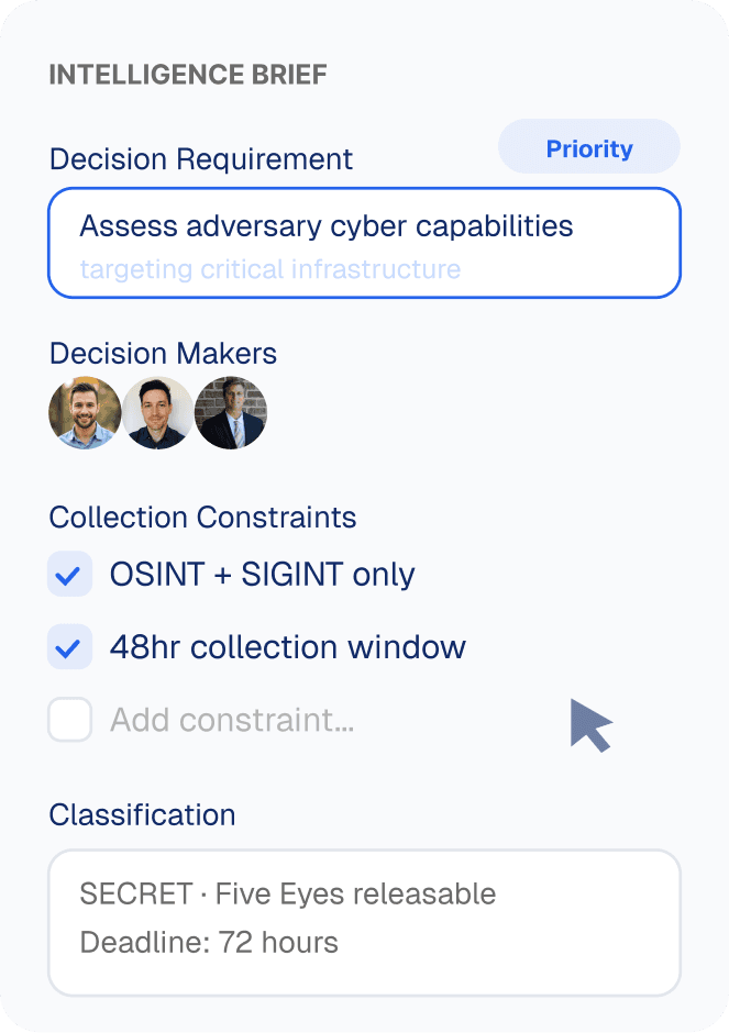 That requires a partner who understands how intelligence professionals actually work — assessing sources, testing hypotheses, structuring analysis under uncertainty. It requires AI that is explainable and auditable, not just powerful. And it requires someone who has operated at comparable levels of institutional complexity and can design for the real environment, not an idealized one.